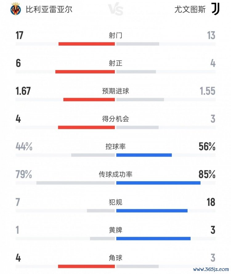 比利亚雷亚尔vs尤文数据:射门17比13、射正6比4、控球率44%比56%