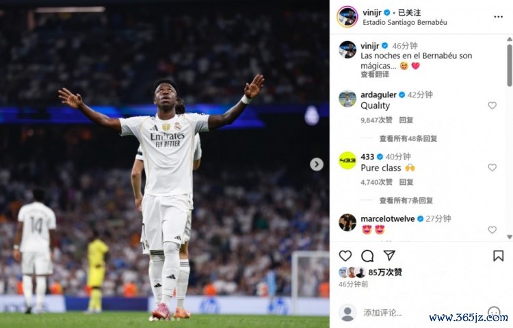 双响立功!维尼修斯晒照庆祝得胜:在伯纳乌的神奇夜晚😉❤️