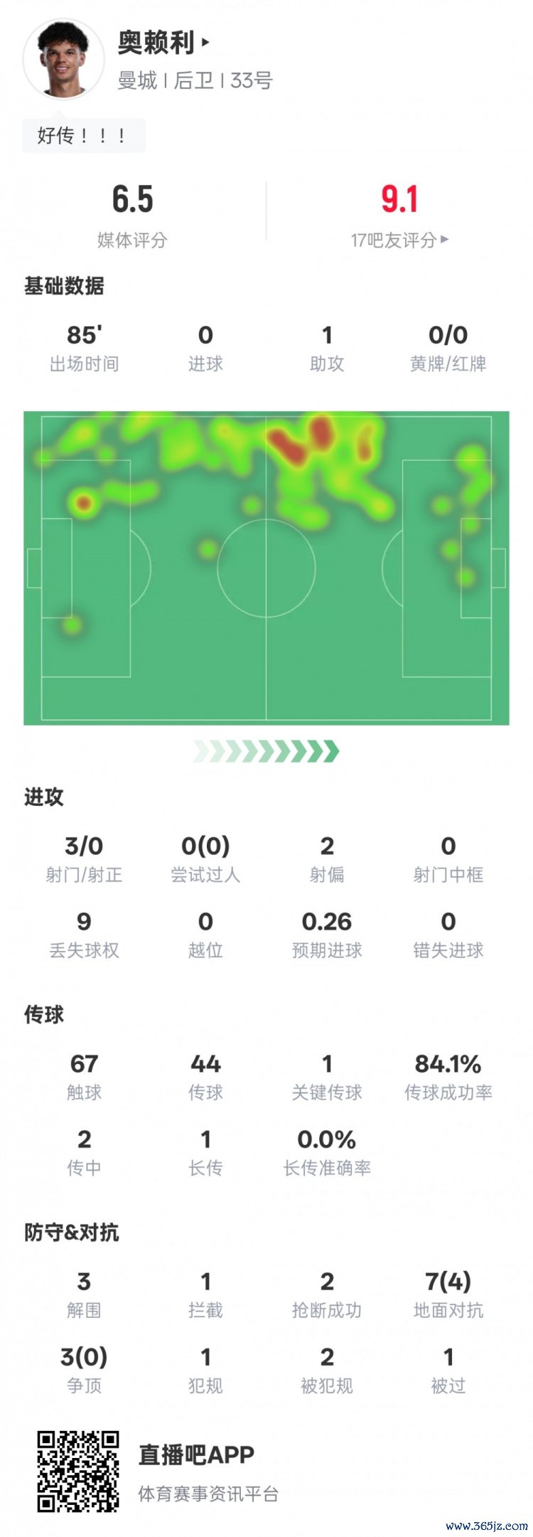 10月18日讯 2025-26赛季英超联赛第8轮,曼城对阵埃弗顿。奥赖利首发出战,送出1次助攻,1次枢纽传球,还有3突围2抢断,评分6.5。