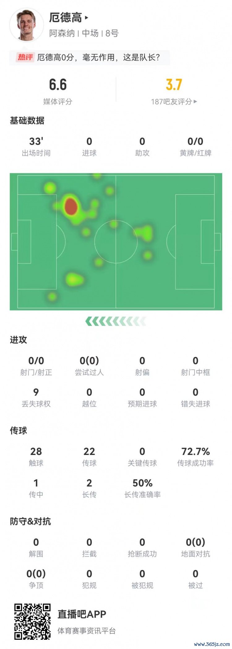 攻防两头数据均挂零!厄德高本场替补33分钟:28触球+9丢失球权