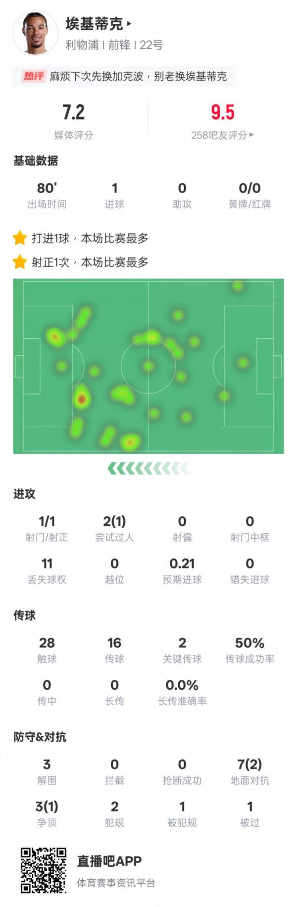 8月26日讯 2025-26赛季英超第2轮,利物浦3-2客胜纽卡。埃基蒂克首发出战,孝敬1粒进球,送出2次要害传球,还有3次突围,评分7.2。 埃基蒂克本场比赛数据: 进球1 助攻0 射门1 射正1 过东谈主2 过东谈主成功1 丢失球权11 触球28 传球16 要害传球2 传球成功率50% 突围3 大地招架7 大地招架成功2 争顶3 争顶成功1 犯规2 被犯规1 被过1......