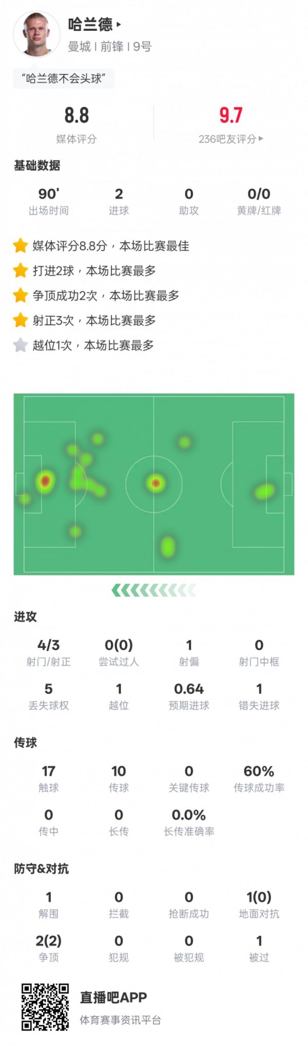 10月2日讯 欧冠联赛阶段第2轮,曼城客场2-2摩纳哥,哈兰德首发出战,4射门3射正,打进2球,评分8.8全场最高。 哈兰德本场比赛数据如下: 进球2 助攻0 射门4 射正3 射偏1 丢失球权5 错失进球契机1 触球17 传球10 传球得手率60% 突围1 大地叛逆1 大地叛逆得手0 争顶2 争顶得手2 被过1......