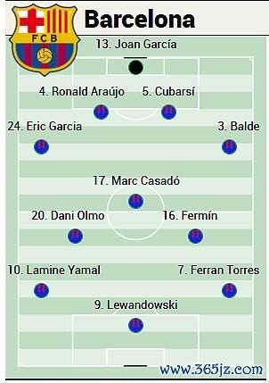 11月22日讯 北京时分今天23点15分,巴萨将在西甲第13轮比赛中主场对阵毕尔巴鄂竞技。《阿斯报》展望了巴萨此役的首发声势。 阿斯报展望巴萨首发 门将:霍安·加西亚 后卫:埃里克·加西亚、阿劳霍、库巴西、巴尔德 中场:奥尔莫、卡萨多、费尔明 前卫:亚马尔、莱万、费兰·托雷斯......