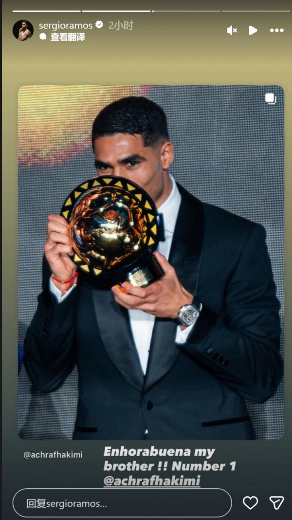 11月22日讯 拉莫斯更新社媒动态,祝愿阿什拉夫当选非洲足球先生。 巴黎边卫阿什拉夫当选2025年非洲足球先生,拉莫斯社媒晒出阿什拉夫领奖的相片,配文:“祝愿你,我的昆季,你是最棒的(Number 1)!”......