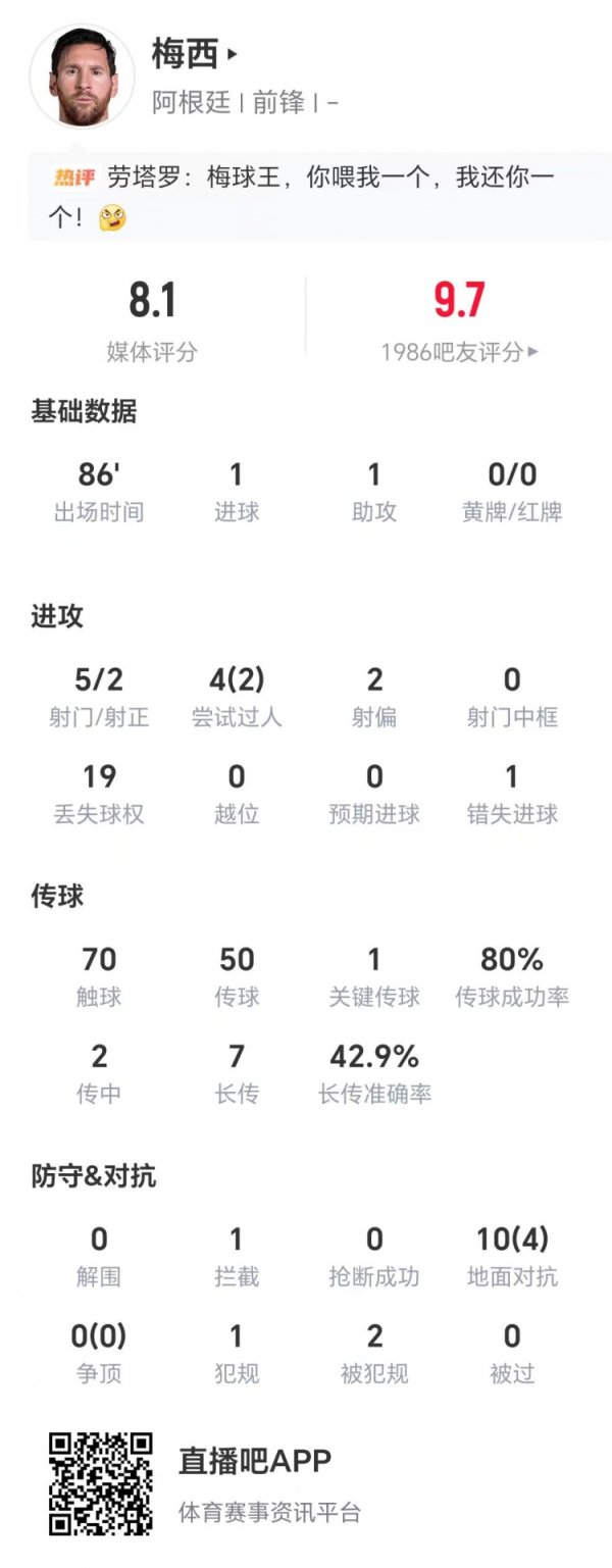 11月15日讯 海外足球友谊赛,阿根廷前去罗安达和安哥拉交手。本场比赛,梅西演出传射好戏,成为场上最大的亮点。比赛第86分钟,梅西被换下。 时间统计数据裸露,梅西本场比赛5射两正,打进1球并送出1次助攻,4次过东说念主两次顺利,1次重要传球,10次大地扞拒顺利4次,获评8.1分。......