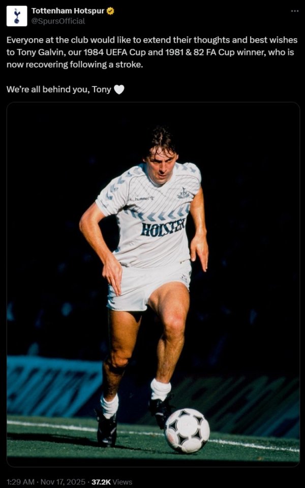 11月17日讯 热刺旧将托尼·加尔文当今正处于中风后的康复进度中,热刺在官方社媒发文为其奉上祝愿。 热刺官方社媒写说念:“俱乐部整体成员向托尼·加尔文致以慰问并奉上好意思好的祝愿,他是俱乐部在1984年赢得欧洲定约杯冠军、1981、1982年赢得足总杯冠军的成员,当今他正处于中风后的康复期。咱们齐援救你,托尼🤍” 托尼·加尔文现年69岁,爱尔兰籍,球员时间司职中场,也能胜任边锋,曾在热刺遵循长达10年。......