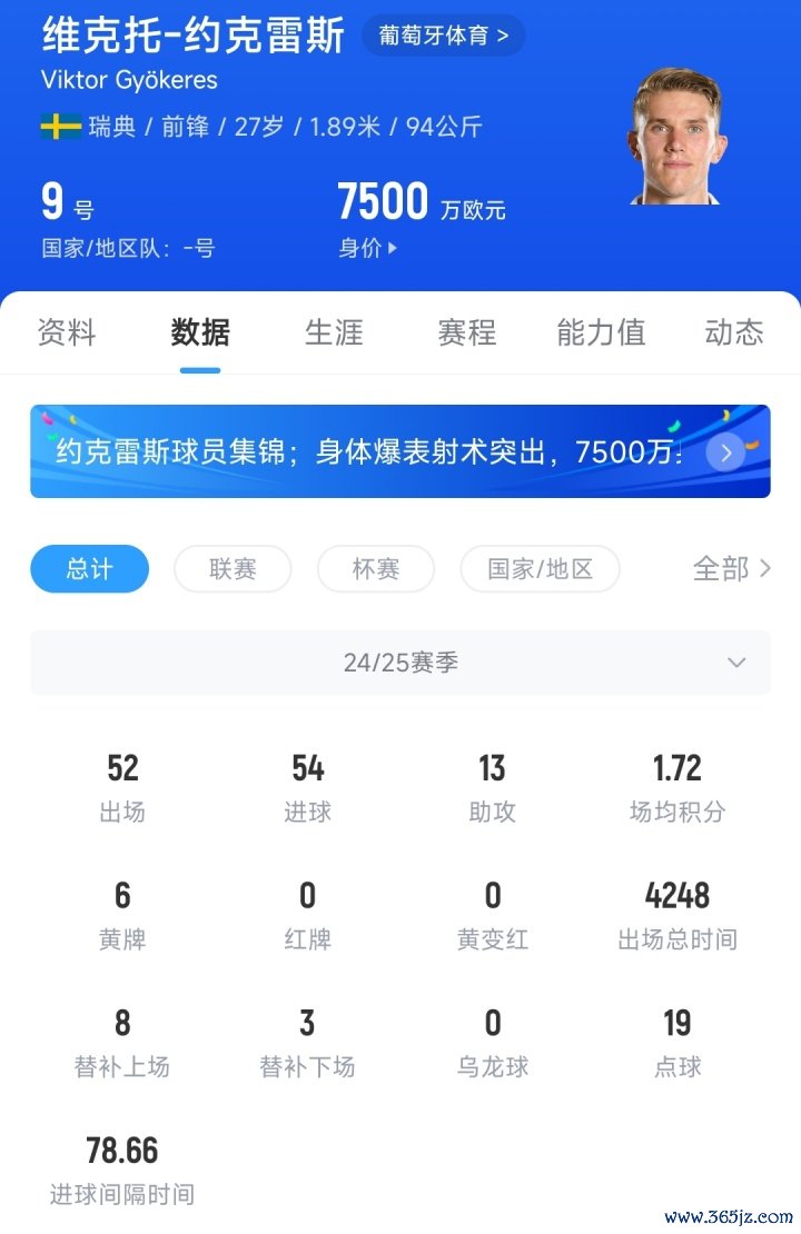 现年27岁的约克雷斯上赛季为葡萄牙体育出战52场比赛,得益54球13助。这位瑞典国脚现身价7500万欧。