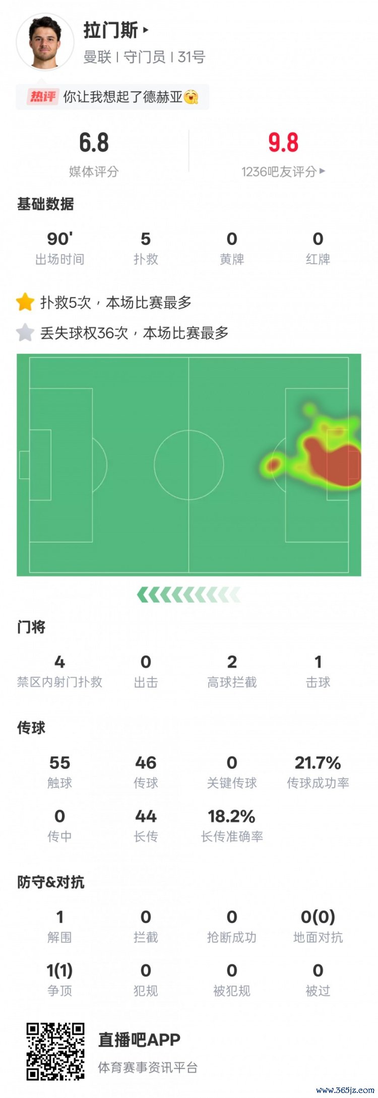 拉门斯本场数据:5次扑救+36次丢失球权均是全场最多,评分6.8