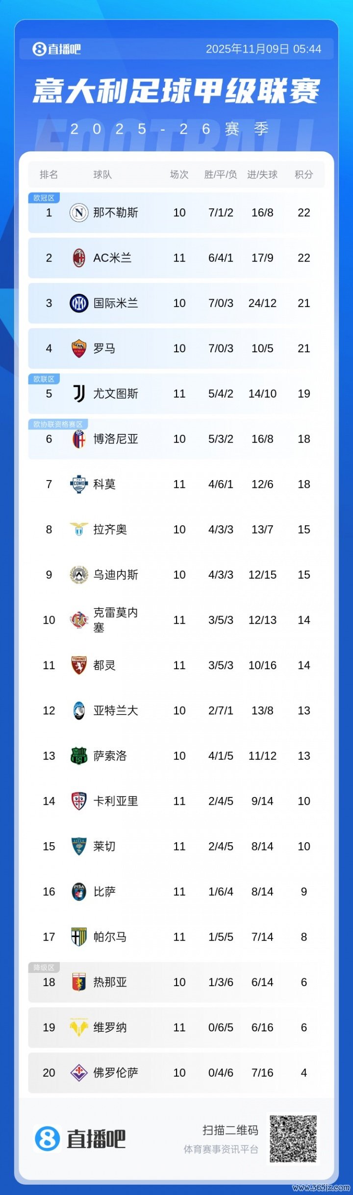 意甲积分榜:米兰先赛积分追平那不勒斯,国米、罗马同积21分