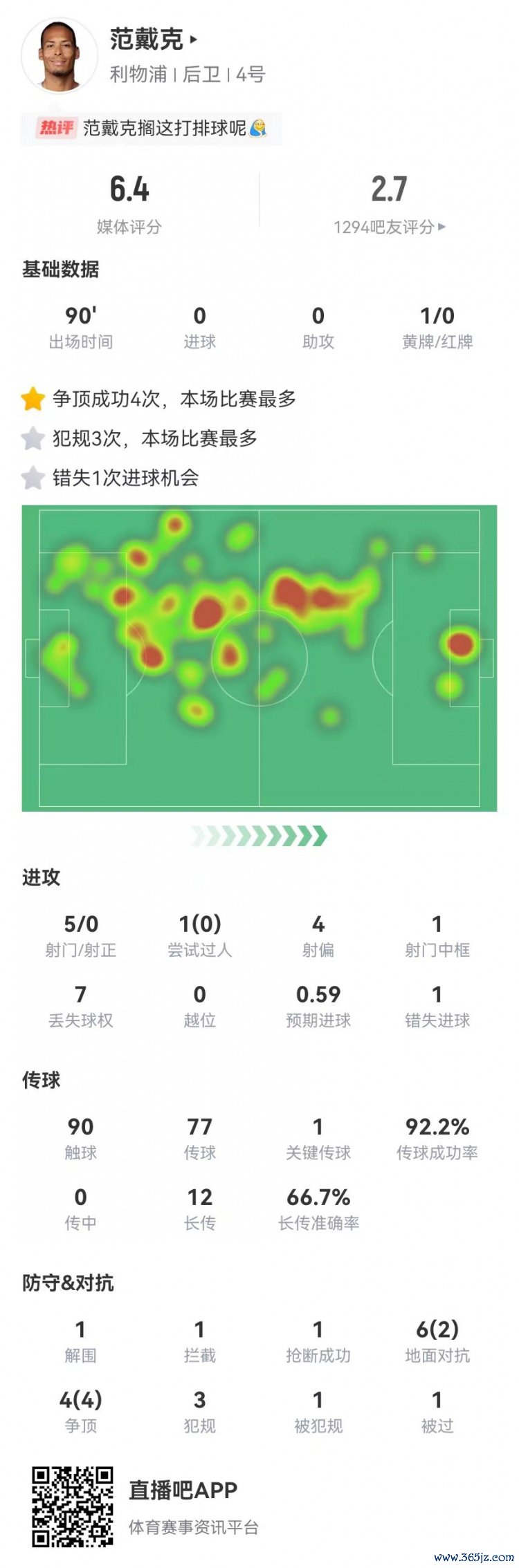 廉颇老矣?范戴克本场5射0正 3犯规+10反抗6生效 获评6.4分