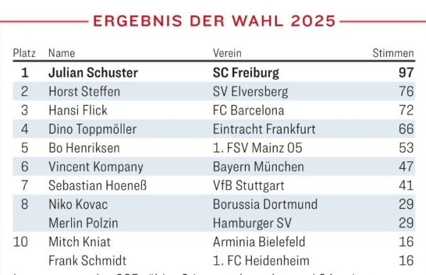 8月11日讯 弗赖堡主帅舒斯特尔当选2025年德国最好教会,《踢球者》公布得票细目,舒斯特尔97票居首,斯蒂芬、弗里克二三位。 2025年德国最好教会得票: 舒斯特尔(弗赖堡)——97 斯蒂芬(埃弗斯堡)——76 弗里克(巴塞罗那)——72 托普默勒(法兰克福)——66 亨里克森(好意思因茨05)——53 孔帕尼(拜仁慕尼黑)——47 小赫内斯(斯图加特)——41 科瓦奇(多特蒙德)——29 波尔津(汉堡)——29 克尼亚特(比勒菲尔德)——16 施密特(海登海姆)——16......