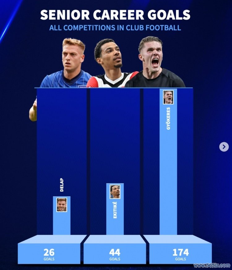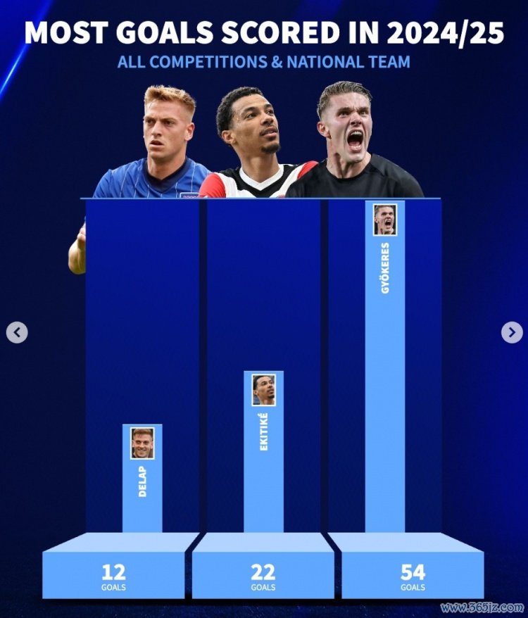 24-25赛季俱乐部+国度队各项赛事总进球:德拉普12球、埃基蒂克22球、约克雷斯54球