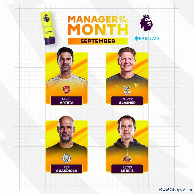 10月2日讯 英超公布9月份最好解释候选名单,阿尔特塔、格拉斯纳、瓜迪奥拉和勒-布里斯入围。