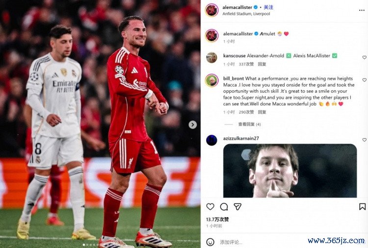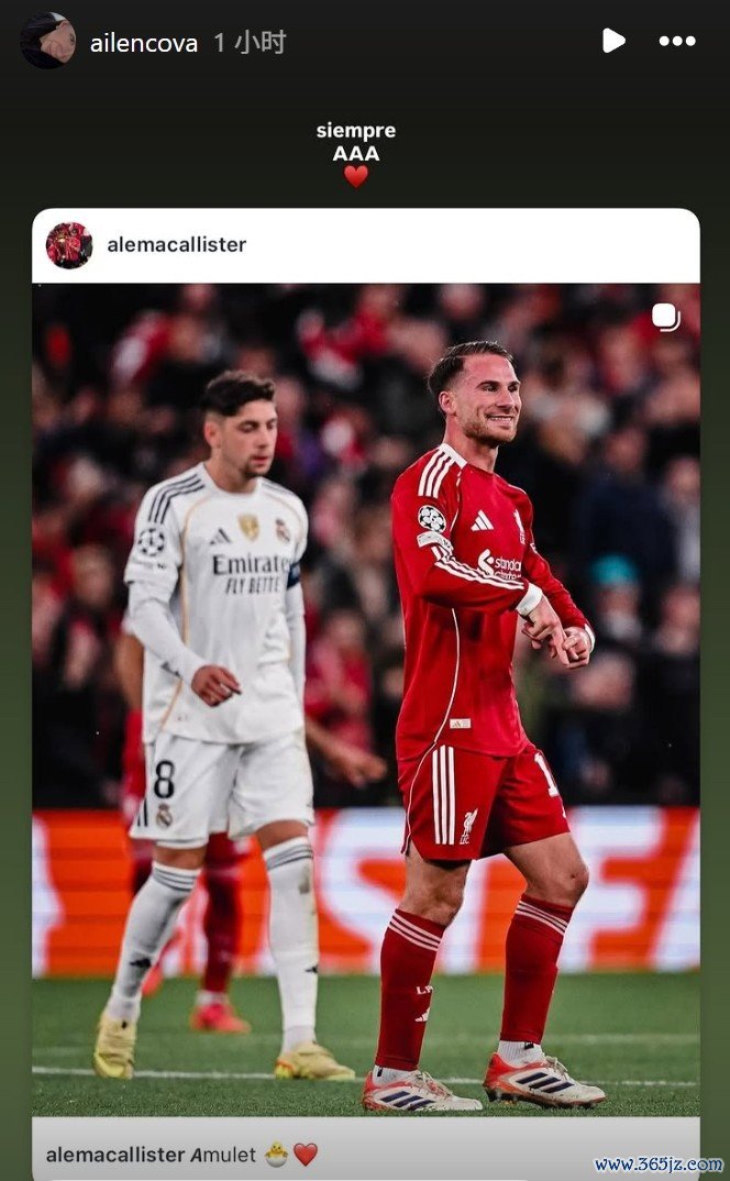 女友也通过社媒用双关请问了麦卡的示爱:“A爱A,遥远”(麦卡利斯特的名字亚历克西斯Alexis以及西班牙语单词“爱amor”的首字母相同为A)。