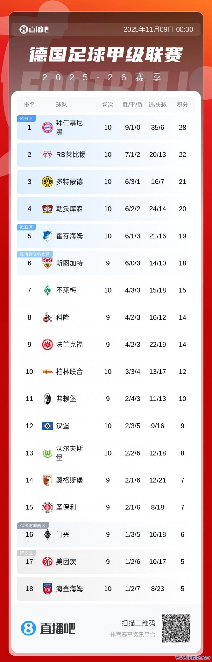 德甲积分榜:拜仁6分领跑,莱比锡第2,多特遭绝平第3,药厂第4