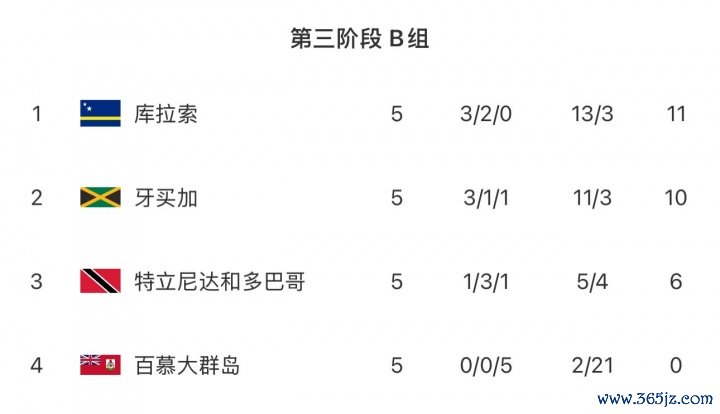11月14日讯 北好意思预选第三阶段第5轮, 库拉索客场7-0狂胜百慕大群岛,牙买加客场1-1遭特立尼达和多巴哥绝平。
