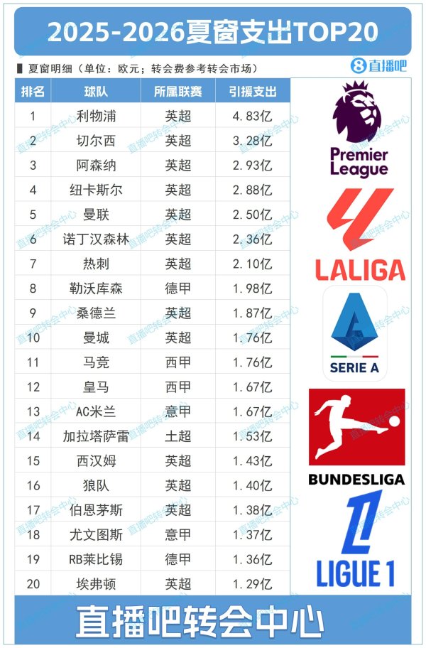 夏窗战火暂熄,硝烟散尽,各队新阵浮出水面。这是一个贪心与资产皆飞的赛季,有东谈主一掷令嫒落下漂泊足坛的重磅炸弹,也有东谈主慧眼识珠觅得被低估的明日之星。当今,是时辰为这个纵容而又精彩的“武备竞赛”作念一次全面的盘货了。 【转会中心】为吧友们转头了夏窗TOP20俱乐部开销。 夏窗TOP20俱乐部开销【注:数据参考德国转会阛阓网】 1:利物浦,英超,4.83亿欧 2:切尔西,英超,3.28亿欧 3:阿森纳,英超,2.93亿欧 4:纽卡,英超,2.88亿欧 5:曼联,英超,2.50......