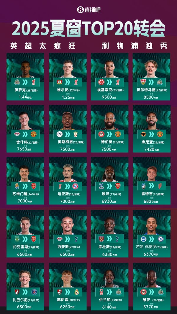 夏窗战火暂熄,硝烟散尽,各队新阵浮出水面。这是一个贪心与财富都飞的赛季,有东谈主一掷令嫒落下动荡足坛的重磅炸弹,也有东谈主慧眼识珠觅得被低估的明日之星。刻下,是本事为这个荒诞而又精彩的“武备竞赛”作念一次全面的盘货了。【转会中心】为吧友们追溯了夏窗刻下TOP20转会,利物浦终点荒诞包揽前三,两次刷新记载! 2025夏窗转会TOP20【注:数据参考德国转会阛阓网】 1:伊萨克 25/先锋 纽卡斯尔→利物浦 1.44亿欧 2:维尔茨 22/中场 勒沃库森→利物浦 1.25亿欧 3......