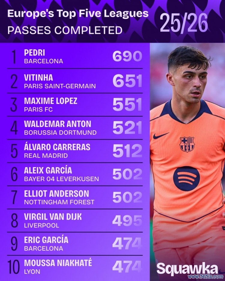 五大联赛球员传球榜:佩德里690次居首,维蒂尼亚651次次之