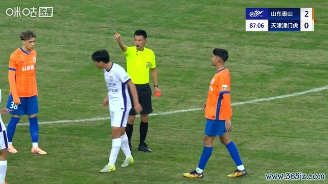 11月01日讯 中超第29轮,山东泰山vs天津津门虎,比赛第87分钟,陈哲宣发火判罚贯穿向主裁李海新输出,主裁先是黄牌申饬,随后径直掏出红牌罚下陈哲宣。
