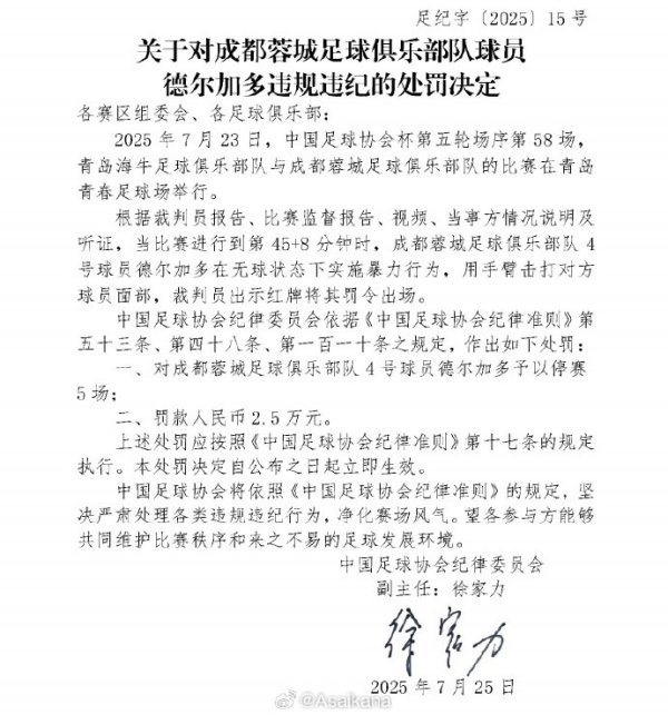 中国足协次第委员会发布罚单,成皆蓉城球员德尔增加因在无球现象下实施暴力行径,击打对方球员面部,被追加停赛5场。 德尔增加将鄙人一轮足协杯与河南的比赛中试验红牌当然停赛。若是成皆蓉城晋级足协杯决赛,其次第经管停赛将在足协杯决赛试验,剩余未试验的赛事将在2026赛季跨赛事试验。若是成皆蓉城莫得晋级足协杯决赛,其次第经管停赛将跨赛事在本赛季后续中超联赛中试验。 中国足协停赛罚单仅可跨赛事到中国鸿沟内的其他赛事,不影响亚足联赛事。......