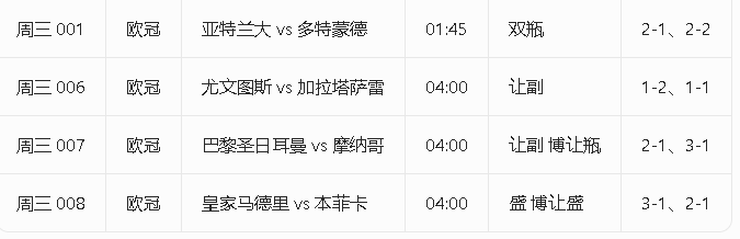 周三001 欧洲冠军杯 亚特兰大 vs 多特蒙德 01:45