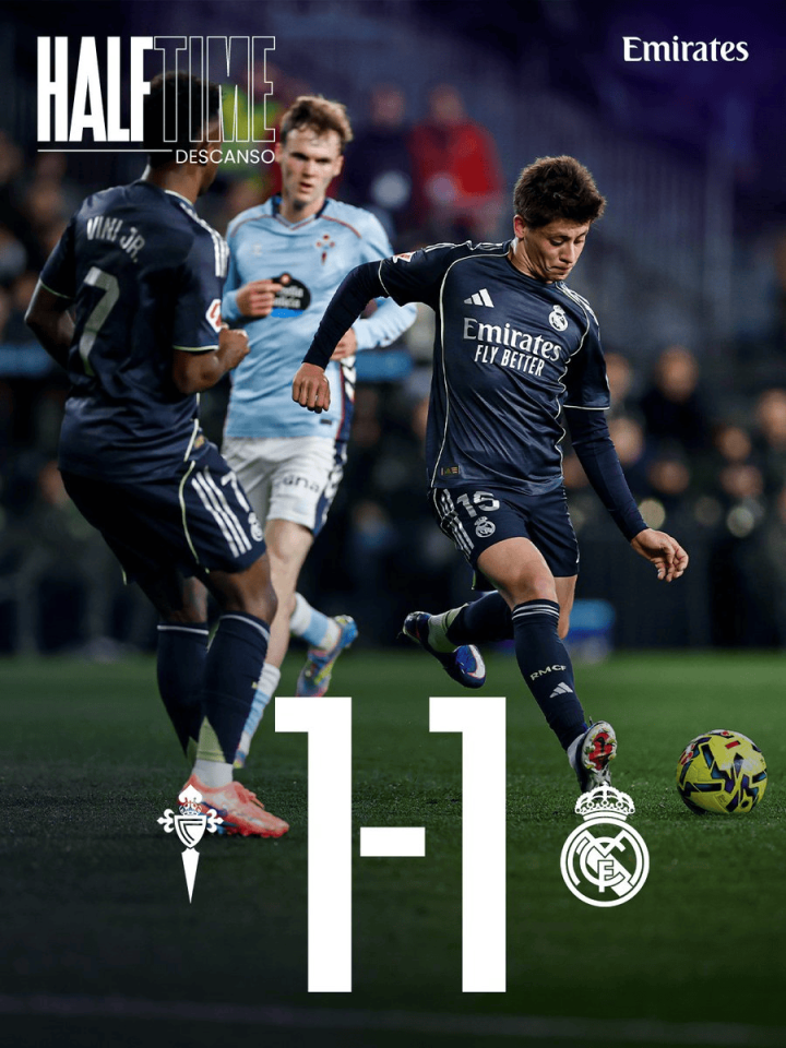 塞尔塔1-1皇马间歇时间时间数据: 持配合的控制权员战术技能术率57%-43%, 射门命中3-1, 中框0-1