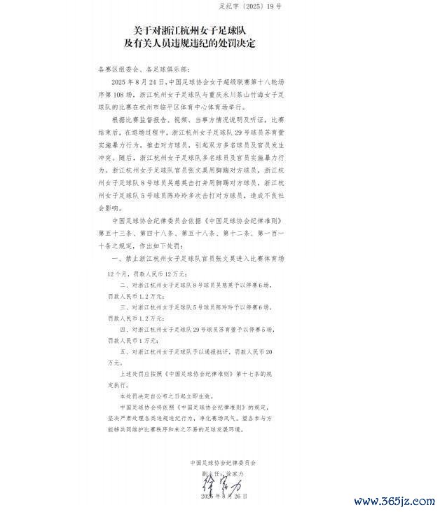 不容浙江杭州女子足球队官员张文昊投入比赛畅通场12个月,罚金东谈主民币12万元;对浙江杭州女子足球队8号球员吴慈英赐与停赛6场,罚金东谈主民币1.2万元;对浙江杭州女子足球队5号球员陈玲玲赐与停赛6场,罚金东谈主民币1.2万元;对浙江杭州女子足球队29号球员苏育萱赐与停赛5场,罚金东谈主民币1万元;对浙江杭州女子足球队赐与通报月旦,罚金东谈主民币20万元。