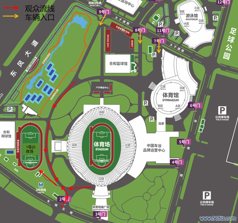 不雅众流线:从武汉体育中心2号门干涉,左转200米,抵达不雅众进口;从武汉体育中心9号门干涉,直行500米,抵达不雅众进口。