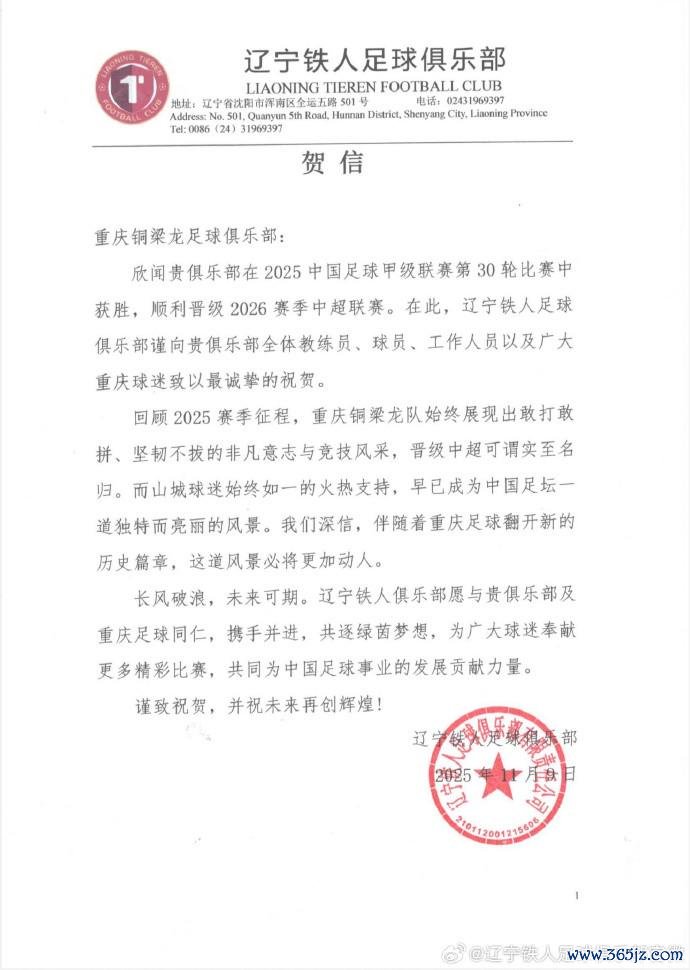 欣闻贵俱乐部在2025中国足球甲级联赛第30轮比赛中收效,顺利晋级2026赛季中超联赛。在此,辽宁铁东说念主足球俱乐部谨向贵俱乐部整体评释员、球员、责任主说念主员以及强大重庆球迷致以最赤诚的道贺。