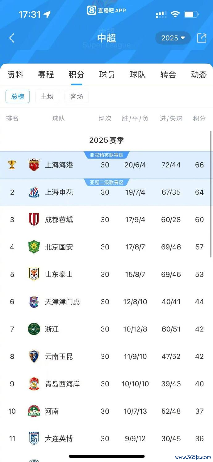 今全国午,2025赛季中超第30轮比赛开启,上海海港在客场1比0打败大连英博,上海申花在客场3比1取胜天津津门虎,最终海港20胜6平4负积66分取得本赛季冠军,并结果自2023赛季以来中超三连冠,申花积64分连接第二年取得中超亚军。中超冠军也连接三年包摄上海。