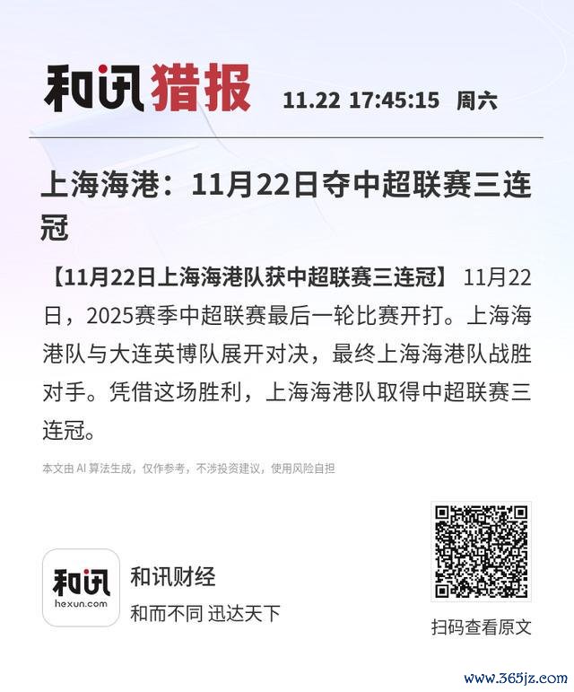 【11月22日上海海港队获中超联赛三连冠】11月22日,2025赛季中超联赛终末一轮比赛开打。上海海港队与大连英博队张开对决,最终上海海港队校服敌手。凭借这场得胜,上海海港队赢得中超联赛三连冠。
