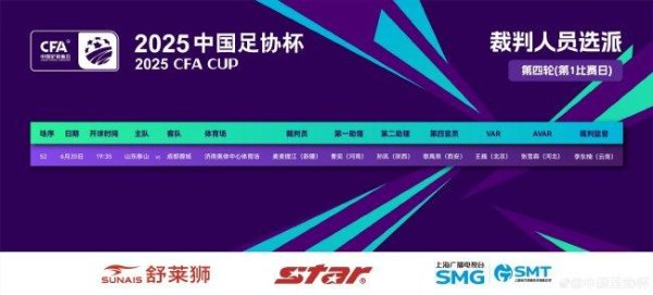 北京技巧6月20日19:35,足协杯1/8决赛,山东泰山镇守主场济南奥体对阵成皆蓉城,麦麦提江将司法本场比赛! 评判员:麦麦提江(新疆) 第一助理:曹奕(河南) 第二助理:孙凯(陕西) 第四官员:穆禹辰(西安) VAR:王巍(北京) AVAR:张雪森(河北) 裁判监督:李东楠(云南)......